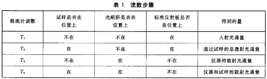 (2)读取数据。首先通过雾度计零点旋钮的调节,使得积分球在暗色时检流计的数值为零。然后按着表1操作,并读取数据T1、T2、T3和T4。
